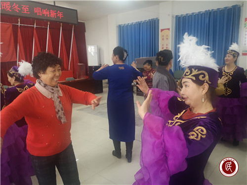 在这个美丽飘雪的日子里,干部与村民们在活动室里展开了一场歌舞盛宴。由干部们组成的舞蹈队给大家带来了传统民间舞蹈——腰鼓舞,由村民们组成的舞蹈队给现场的群众们展示了哈萨克族特色舞蹈——黑走马,村民张特生的诗朗诵,赵明华的爱国歌曲,热闹非凡的知识抢答赛,节目种类多种多样,活动在大伙的欢声笑语中如火如荼的进行着。伴着欢快的音乐,村民们载歌载舞,村委会呈现一片其乐融融的景象。