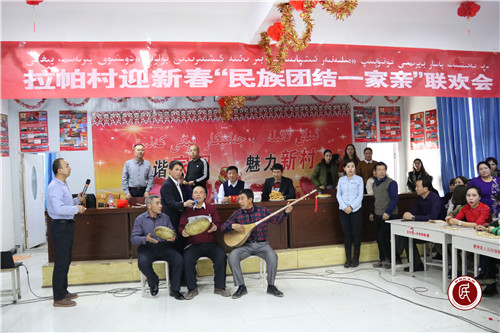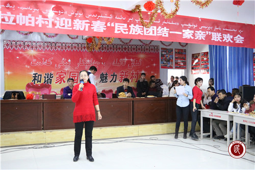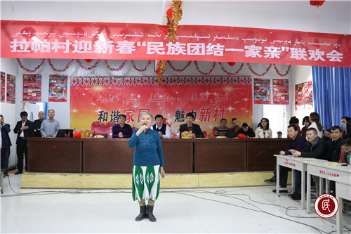 新疆民生网(罗世山) 2月5日下午,自治区人民检察院驻拜城县赛里木镇拉帕村工作队组织全体村民举办的2019年迎新春“民族团结一家亲”联欢会在拉帕村文化活动中心举行。来自自治区人民检察院、库尔勒铁路运输检察院、塔里木检察院的二十多名结亲干部和拉帕村全体村民们兴高采烈地汇集在一起参加此次联欢会。舞蹈、小品、独唱、戏曲演唱、击鼓传花、盲人摸象……一个个丰富精彩的节目和游戏吸引着每个人的眼球,把在场的每个人带入了欢乐的海洋。这场精心准备的春节联欢会给前来参加“民族团结一家亲”的结亲干部和所有的村民们带来了一场精彩纷呈的视听盛宴。