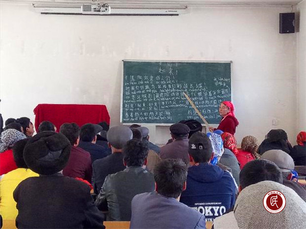 3月16日晚,拜城县财政局驻康其乡欧斯库依村工作队队员、宣讲员帕丽旦木·托乎尼亚孜正在带领村民们用汉语学唱国歌。为了更好的教好村民们唱国歌,工作队员帕丽旦木把国歌的歌词用汉字和拼音注音写在黑板上,让村民们自行抄到自己笔记本上,再由“访惠聚”驻村工作队员领唱,宣讲员教唱,党员、共青团员带头唱,群众跟着唱。