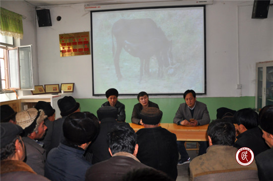 (图:克州林业局驻阿克陶县巴仁乡古勒瓦格村工作队开展扶贫养驴养殖户培训。)
