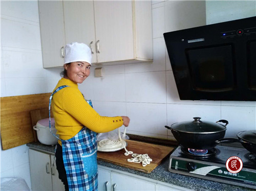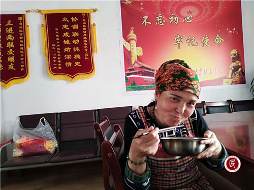 古丽努尔·吾斯曼今年46岁,生活坎坷,曾经有过两段失败的婚姻,目前独自抚养唯一的儿子。年初工作队在入户走访中了解到她家的具体情况后,得知她曾经在学校食堂做过饭,为从根子上解决问题,就聘请她为工作队的厨师,这样可以保证她每月有一定的固定收入,孩子上学和家庭生活就有了保障。