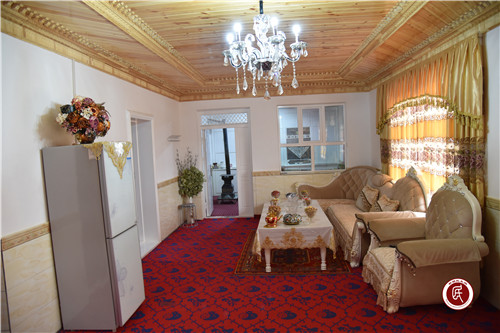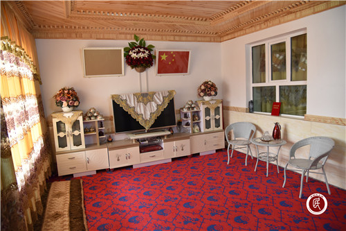 “这是我们家的客厅,今年刚买的新沙发、茶几。”村民阿斯姆罕·喀吾力大婶看到自己家的客厅跃然大屏幕上,高兴地向身边的村民介绍着。