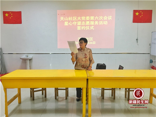 志愿服务协议签订活动中,工行、建行、友好医院、区图书馆四个单位代表分别与社区书记签订“星心守望”志愿服务协议卡。大党委成员单位工商银行代表朱静进行发言,他表示,党的十八大以来,以习近平同志为核心的党中央高度重视我国老年人养老问题。2013年12月,习近平同志在考察北京市四季青敬老院后指出,我国老年人口增加很快,老年服务产业发展还比较滞后。要完善制度、改进工作,推动养老事业多元化、多样化发展,让所有老年人都能老有所养、老有所依、老有所乐、老有所安。这充分体现了党中央对全国老年人的深切关怀,也明确指出了我国养老事业发展的方向。我们作为天山社区“访惠聚”工作队派出单位及大党委成员单位,一定扎实落实好单位的后盾作用,用心用情用力做好关爱工作,让我们共同祝愿社区的老年居民身心健康,快乐幸福。