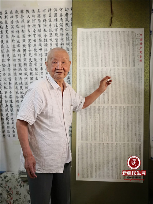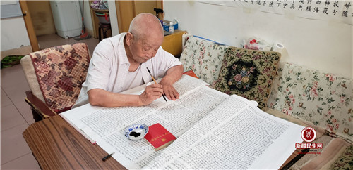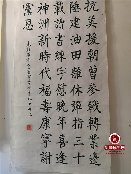新疆民生网(朱向伟)“抗美援朝曾参战,转业边陲建油田,离休弹指三十载,读书练字慰晚年,喜逢神州新时代,福寿康宁谢党恩。”一副一米多高的书法作品赫然悬挂在黄甫宽老人的卧室里,这首诗既回顾了老人的一生,又抒发了对党的感恩之情。